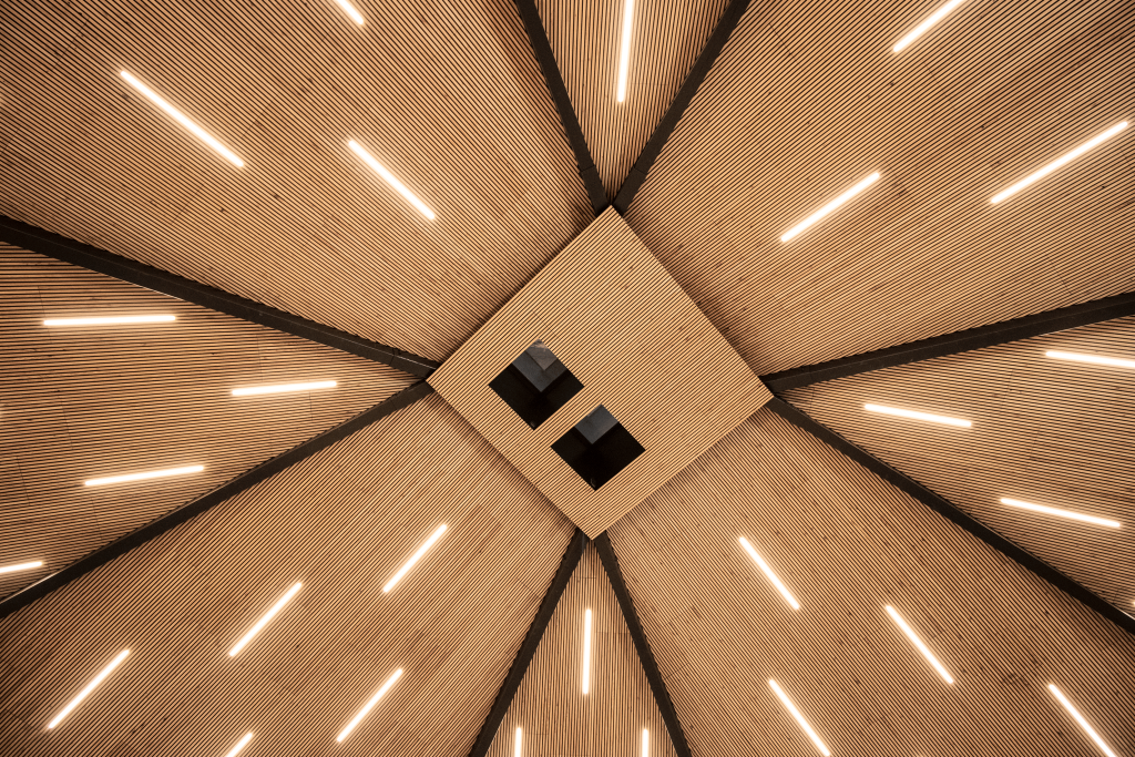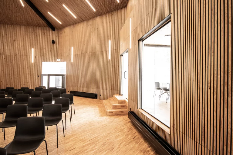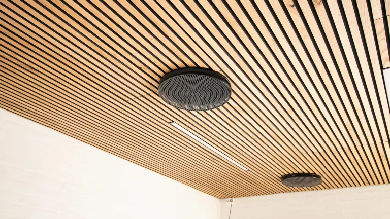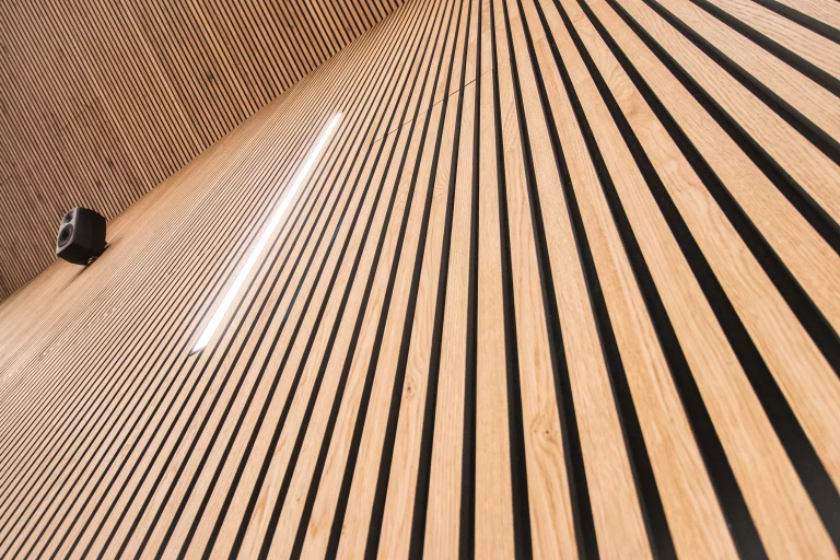 The panels are tastefully installed both on the ceiling and walls in the spacious open area, providing excellent acoustic solutions.