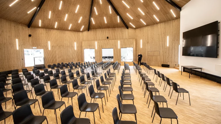 The conference room boasts a vast open space in the center, adorned with hundreds of chairs facing a massive digital screen, perfect for presentations during larger conferences.