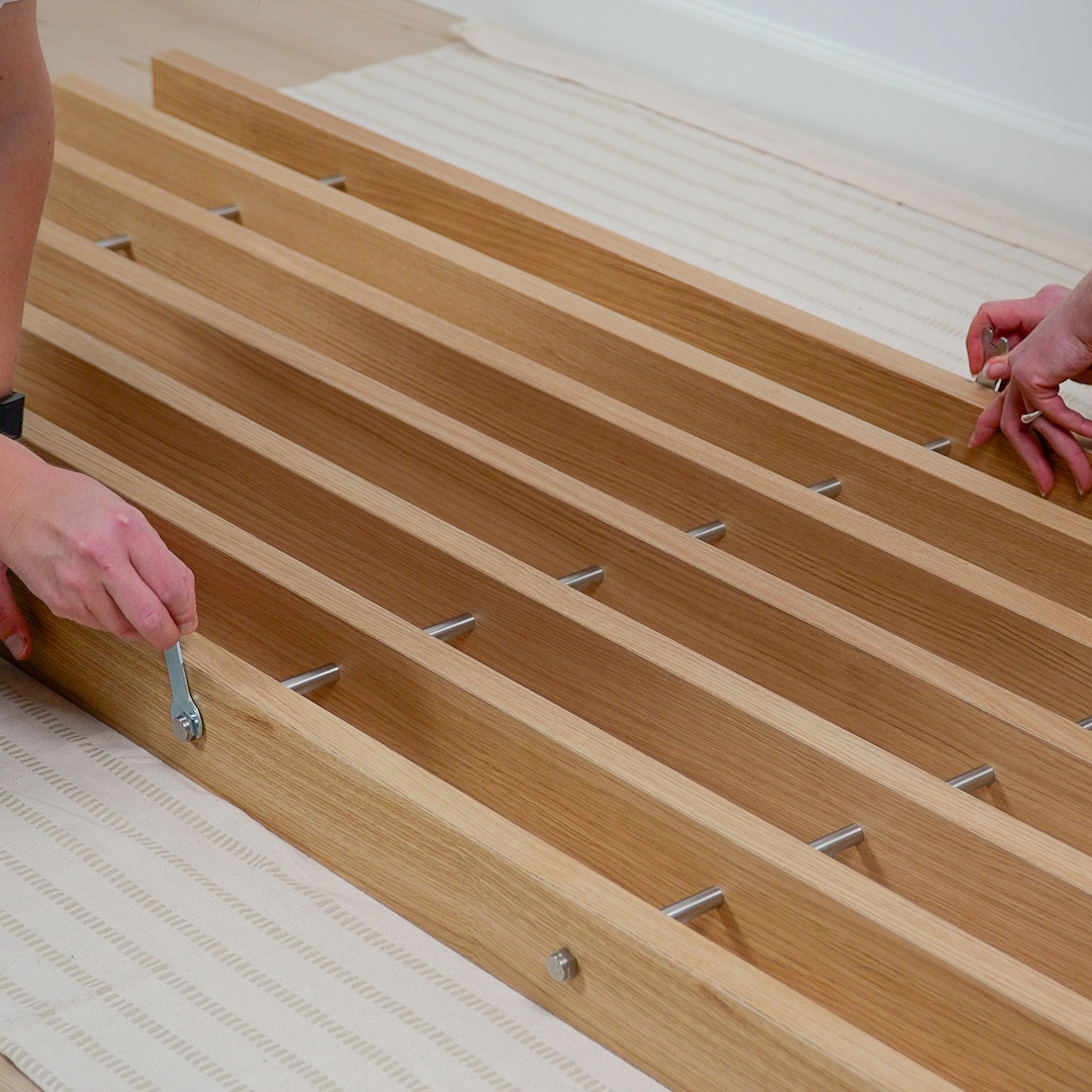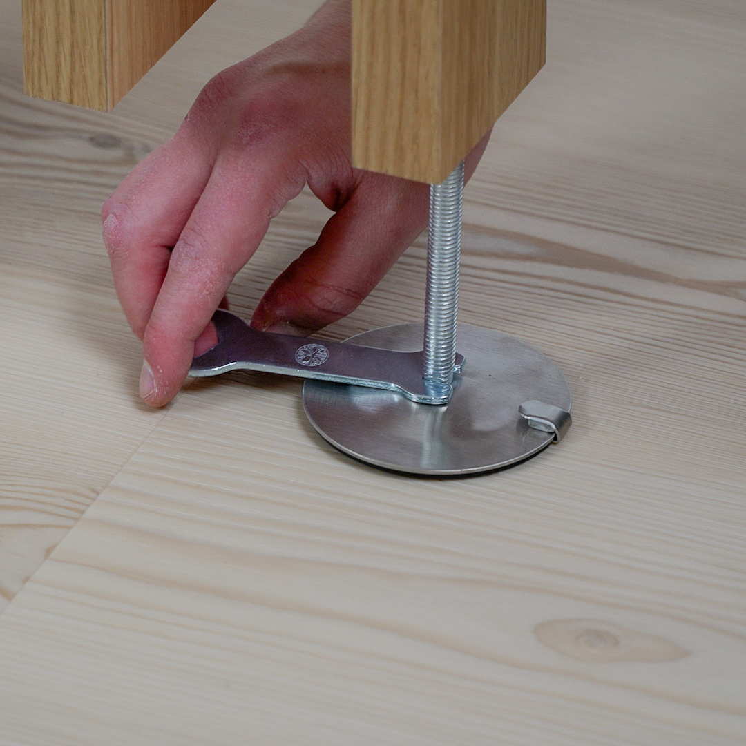 Embrace is installed using a tension system that allows the modules to stand securely between floor and ceiling. For added stability, the system needs to be secured with screws in both the floor and the ceiling.