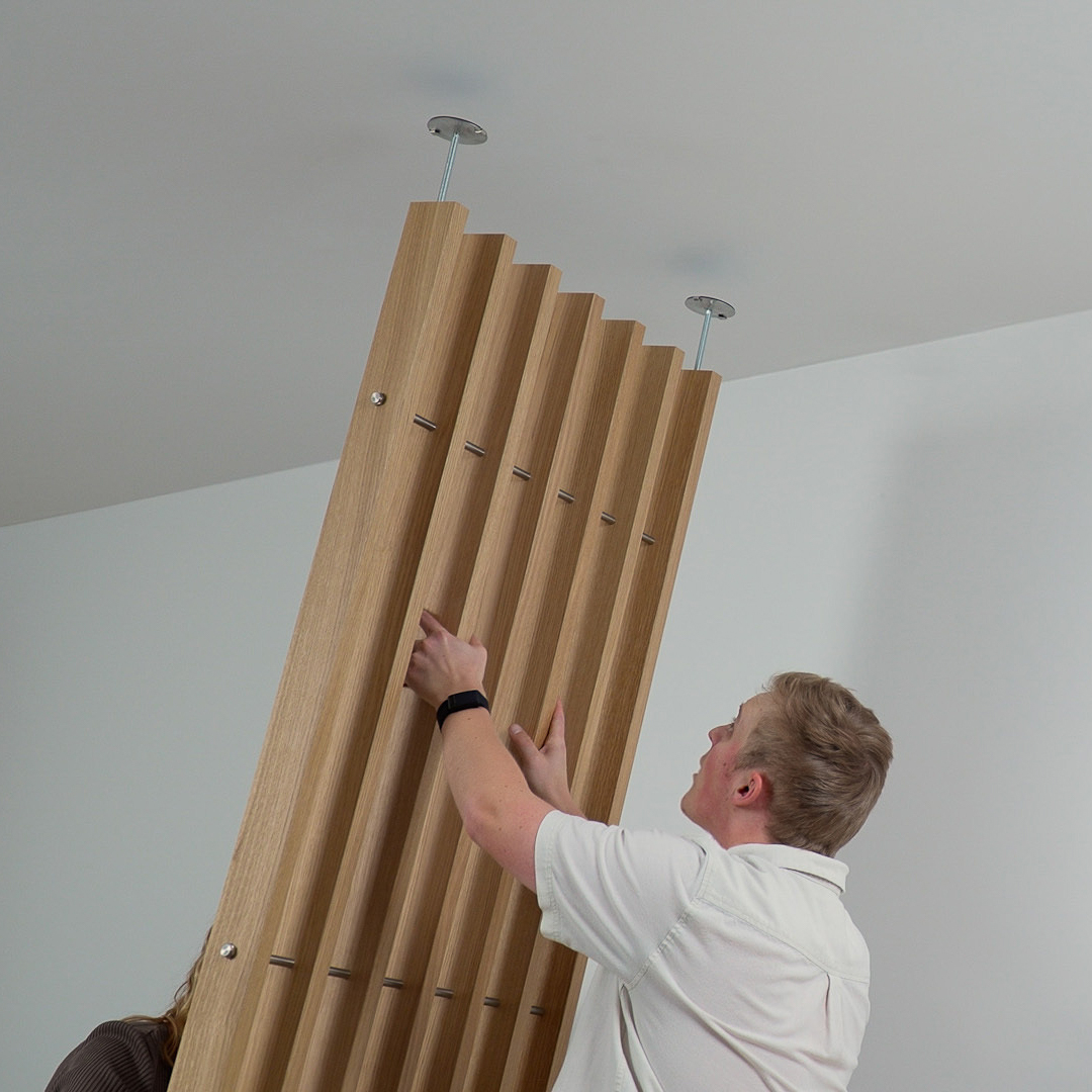 Embrace is a room divider system that mounts between floor and ceiling. It creates clear zones and installs in just an hour.