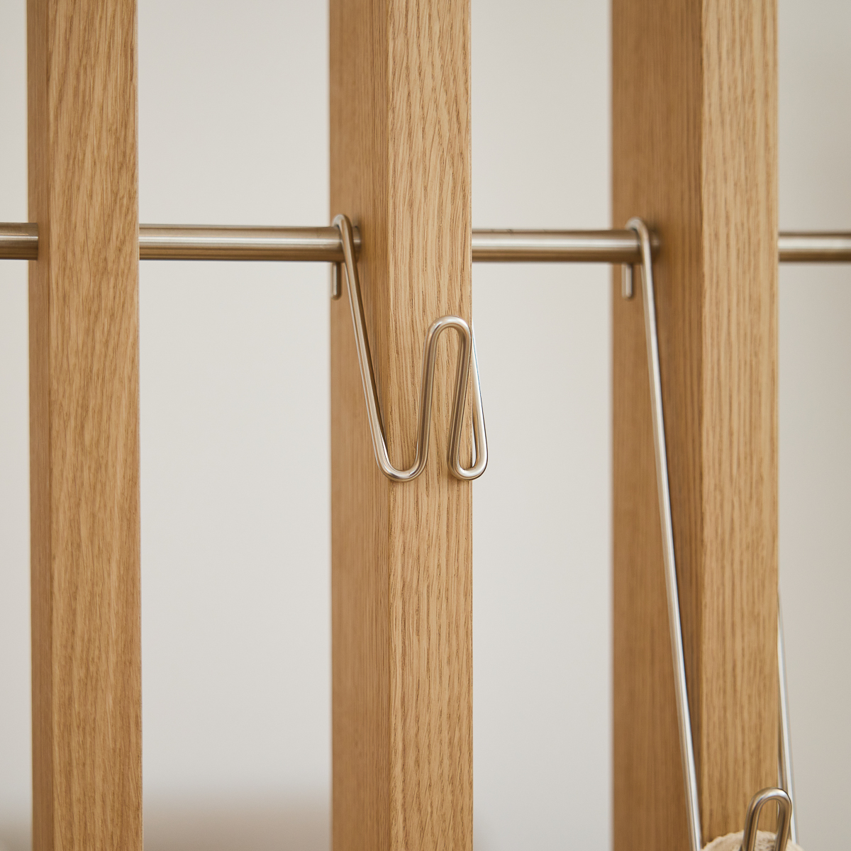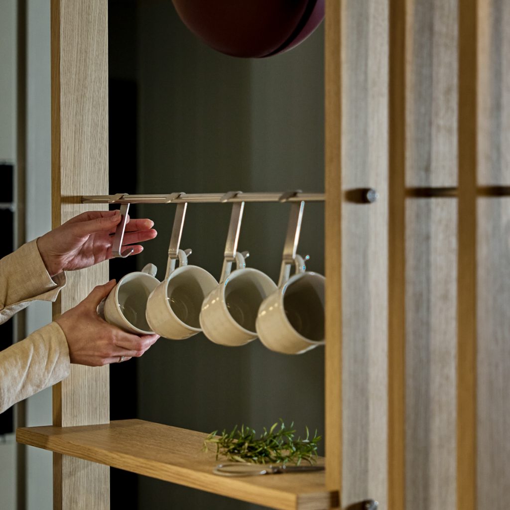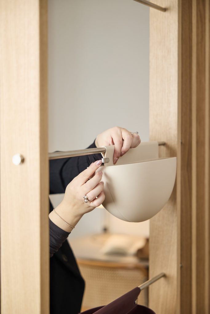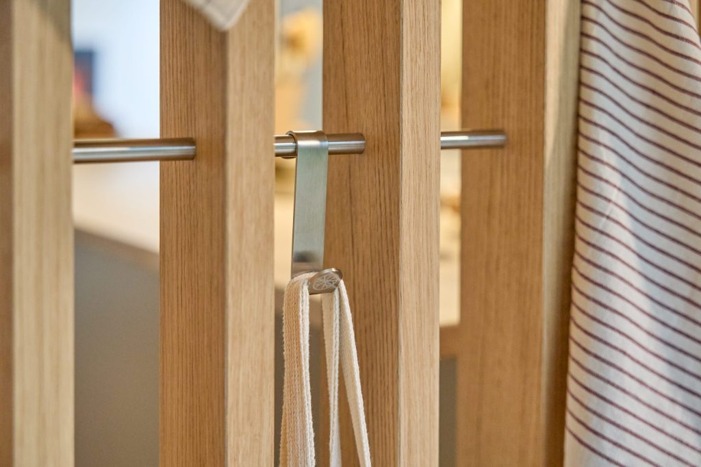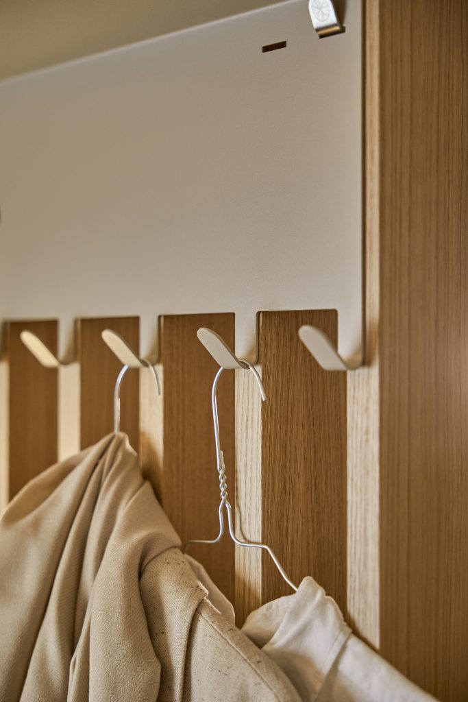 Embrace is built from oak veneer and stainless steel and consists of modular elements that can be arranged and adjusted over time. It’s designed to divide space while keeping rooms open and usable.