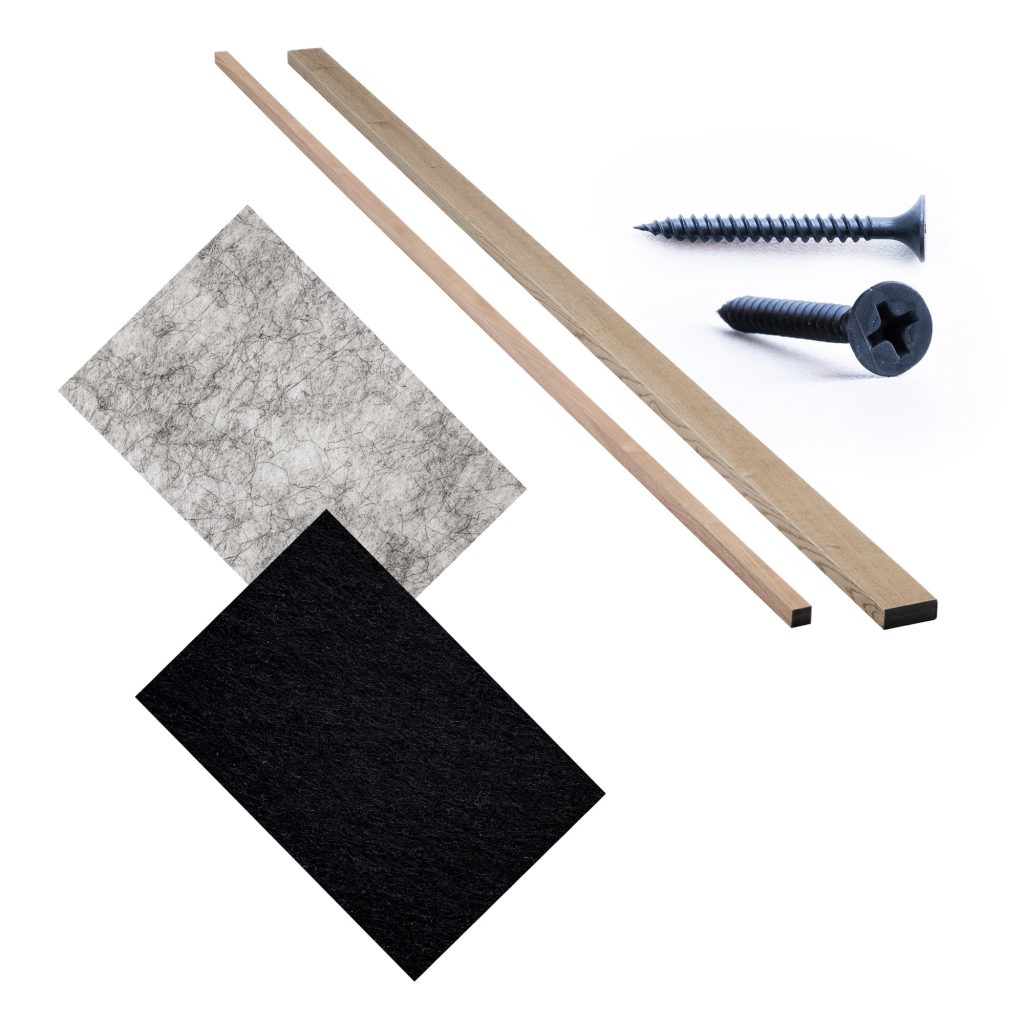 The acoustic felt improves both aesthetics and sound environment. Designed to absorb sound waves, it dampens noise, creating a more comfortable and peaceful atmosphere in your home. Our acoustical felt is made from 50% recycled plastic, which means that we take a waste product and transform it into something useful and beautiful.